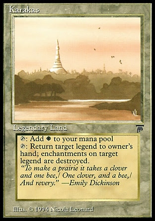 Bartel Runeaxe is another one that's actually a Giant, as revealed by the revised version of the card released some time later. A very uninteresting-looking giant, though. Also, Tuknir Deathlock is apparently just a head floating in the mist (with a fancy Triceratops helmet!) but is in reality just a human wizard. In addition to legendary creatures, we also have legendary lands, like the city of Karakas. S'neat.